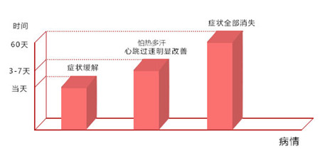 1、疗程短、60天治愈:治疗当天,症状缓解,治疗3-7天,怕热多汗、食欲亢进等症状明显改善。