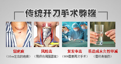 传统手术开刀治疗,切除部分或全部甲状腺,不仅会留下6-10厘米的大疤痕,还会导致终身甲减,需要一直吃药。